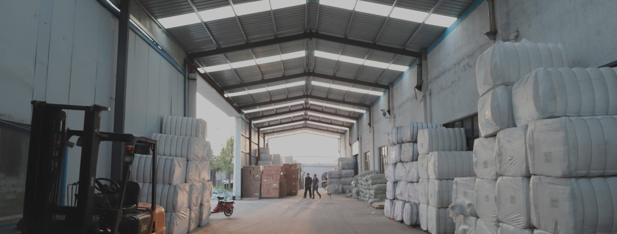 The warehouse is stacked with raw materials for producing sewing threads